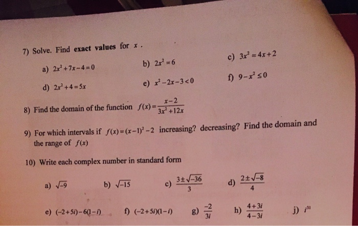 Solved Solve Find Exact Values For X A 2x 2 7x 4 0 B